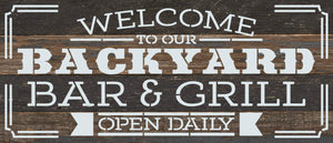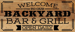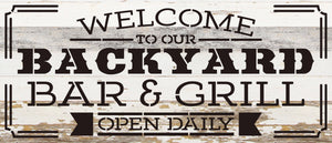 Welcome to our backyard bar and grill open daily / 14"X6" Reclaimed Wood Sign