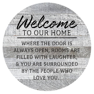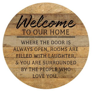 Welcome to our home. Where the door is always open, rooms are filled with laughter, & you are surrounded by the people who love you. 16in Round Reclaimed Wood Wall Décor//16" Reclaimed Wood Sign //Second Nature by Hand product is Made in the USA by skilled craftsmen in WI. We source distressed reclaimed materials throughout North America that ensures no two Second Nature by Hand signs in the world are the same. The wood for this sign may have come from a ship yard, old factory or a huge variety of other sources. Buying reclaimed wood products is good for the environment. Due to the reclaimed nature of this product, colors and wood tones/features may vary slightly.