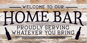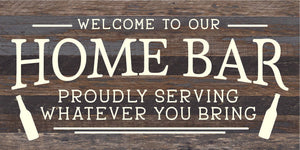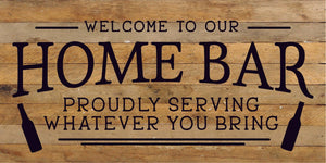 Welcome to our Home Bar: proudly serving whatever you bring / 24x12 Reclaimed Wood Sign