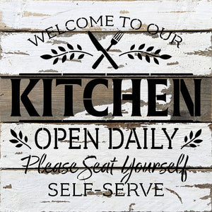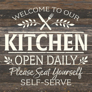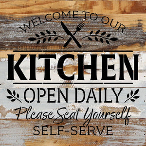 Welcome to our Kitchen Open Daily. Please seat yourself. Self-Serve / 14x14 Reclaimed Wood Wall Decor