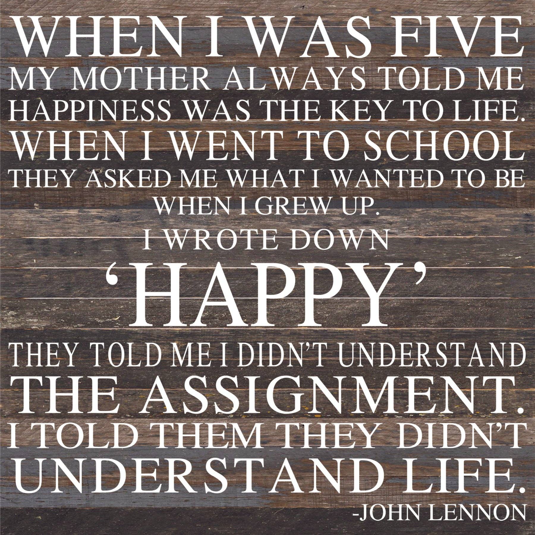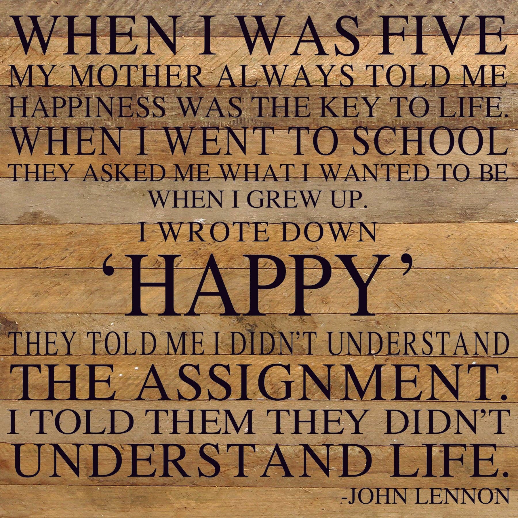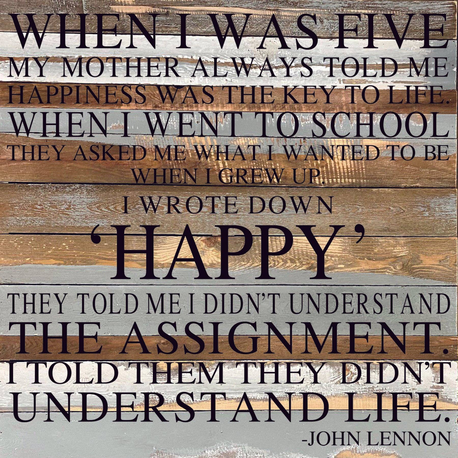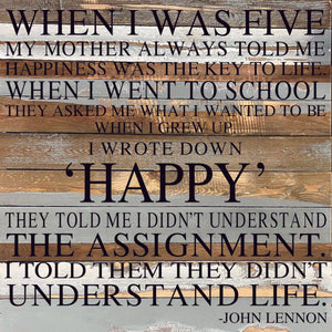 When I was five my mother always told me happiness was the key to life. / 28"x28" Reclaimed Wood Sign