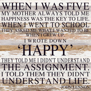 When I was five my mother always told me happiness was the key to life. When I went to school they asked me what I wanted to be when I grew up. I wrote down 'HAPPY' They told me I didn't understand the assignment. I told them they didn't understand life. - John Lennon