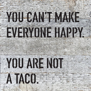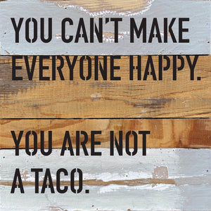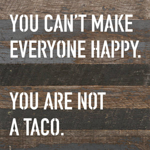 You can't make everyone happy you are not a taco 10x10 Reclaimed Wood Wall Décor Second Nature by Hand product are Made in the USA by skilled craftsmen in WI. We source distressed reclaimed materials throughout North America that ensures no two Second Nature by Hand signs in the world are the same. The wood for this sign may have come from a ship yard, old factory or a huge variety of other sources. Buying reclaimed wood products is good for the environment. Due to the reclaimed nature of this product, colors and wood tones/features may vary slightly.