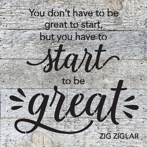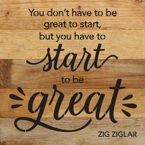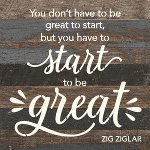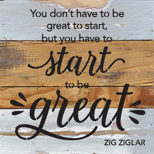 You don't have to be great to start, but you have to start to be great - Zig Ziglar 10x10 Reclaimed Wood Wall Décor. Second Nature by Hand product are Made in the USA by skilled craftsmen in WI. We source distressed reclaimed materials throughout North America that ensures no two Second Nature by Hand signs in the world are the same. The wood for this sign may have come from a ship yard, old factory or a huge variety of other sources. Buying reclaimed wood products is good for the environment. Due to the reclaimed nature of this product, colors and wood tones/features may vary slightly.
