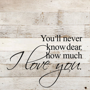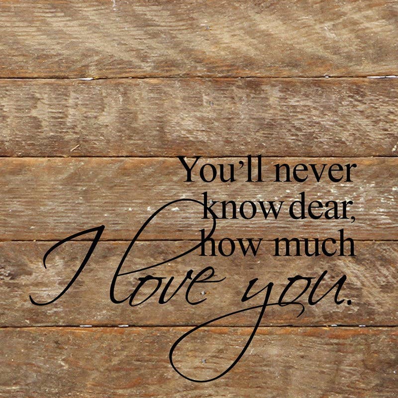 Product: You'll never know dear, how much I love you. / 10"x10. At Second Nature by Hand, we create unique, one-of-a-kind wall signs that tell a story and carry a piece of history. Made from reclaimed materials, these limited-edition pieces are a testament to our commitment to preserving the old-world craftsmanship. Our products are not just decor, they are fleeting treasures. Each piece is handmade to order, capturing the soul of century-old buildings in every detail. Let our artwork enhance your home and echo the love you cherish.