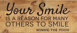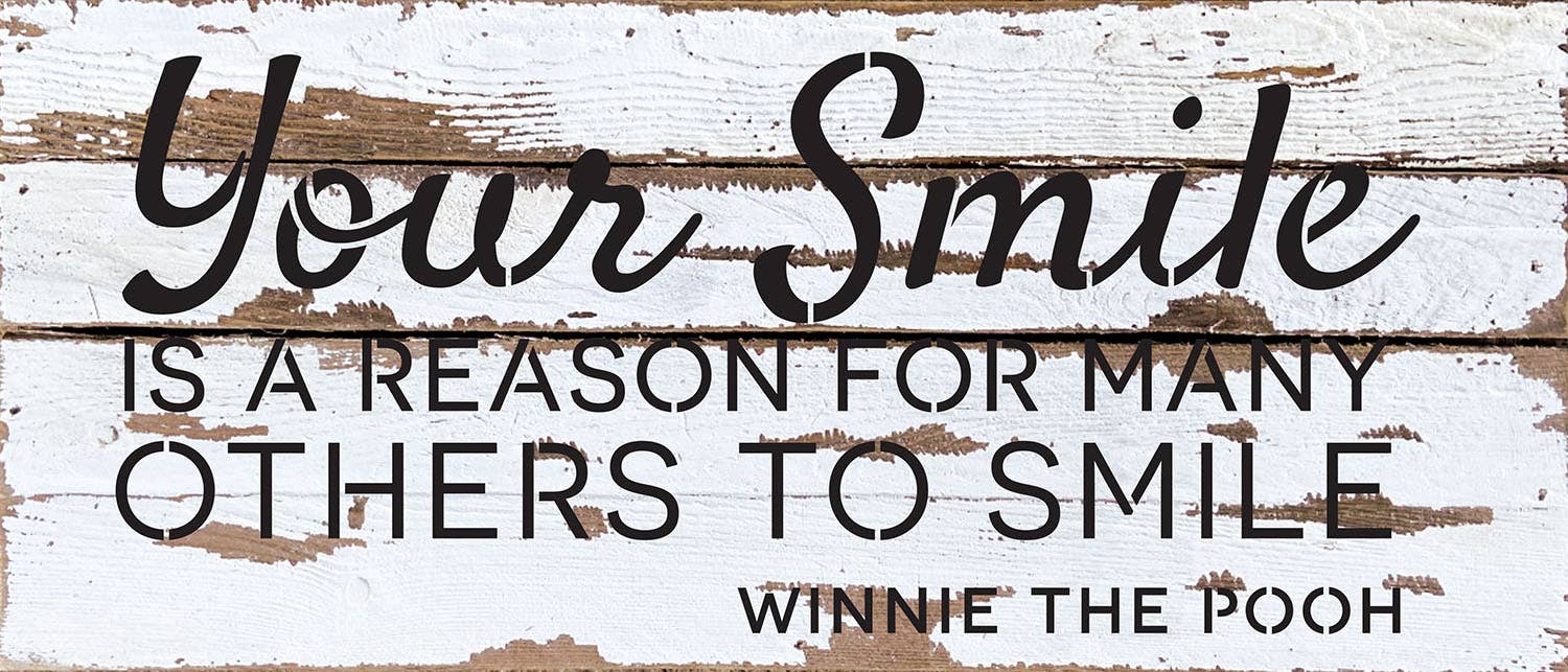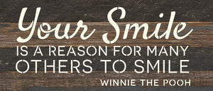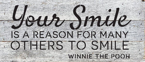 Your smile is a reason for many others to smile - Winnie the Pooh 14x6 Reclaimed Wood Wall Decor Sign//14"x6" Reclaimed Wood Sign //Second Nature by Hand product is Made in the USA by skilled craftsmen in WI. We source distressed reclaimed materials throughout North America that ensures no two Second Nature by Hand signs in the world are the same. The wood for this sign may have come from a ship yard, old factory or a huge variety of other sources. Buying reclaimed wood products is good for the environment. Due to the reclaimed nature of this product, colors and wood tones/features may vary slightly.